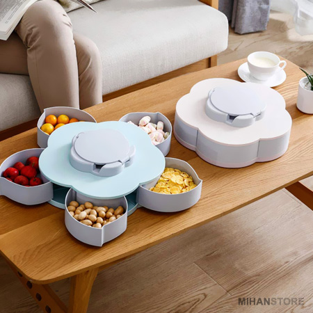 ویژگی خاص اردوخوری چرخشی طرح گل که آن را برای مشتری ها جذاب کرده چرخشی بودن ظرف و پنهان کردن محتوای تنقلات داخل ظرف می باشد. در نگاه اول شما ظرفی فانتزی طرح گل خواهید دید که با چرخاندن سوییچ روی آن به آرامی تنقلات پنهان شده بیرون آمده و جلوه ای جالب و جادویی به محصول میدهد. این اردوخوری جالب چرخشی همچنین دارای یک درب قلبی بازشو روی سوییچ چرخان میباشد که میتوانید با باز کردن آن شیارهایی برای نگهداری گوشی وجود دارد که میتوانید گوشیتان را به حالت ایستاده برای تماشای فیلم روی آن قرار دهید. می توانید از اردوخوری چرخشی طرح گل برای پذیرایی انواع مواد خوراکی در صبحانه و عصرانه استفاده کنید. بدلیل زیبایی انحصاری این ظروف و دوام و کیفیت مناسب آن شما می توانید از این ظروف جذاب را برای پذیرایی در هتل ها، رستوران، سلف سرویس ها و … نیز استفاده کنید.